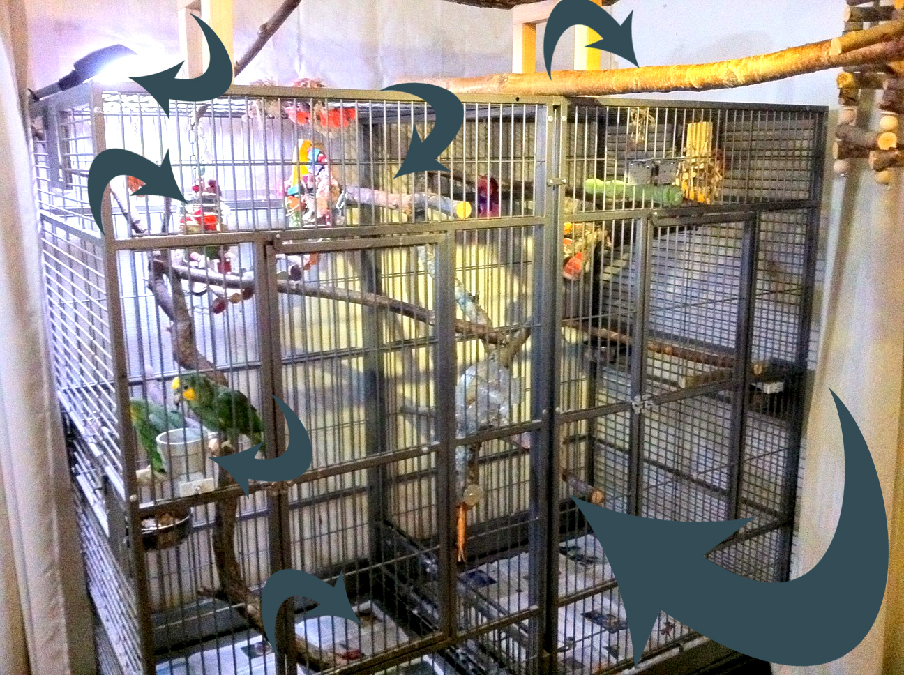 Kuva, jossa on hyvin edustettuna suuri osa perustarvikkeista: suuri häkki, lintulamppu, hyvät orret, tarpeeksi virikkeitä/leluja, ruoka- ja juomakupit, hyvä pohjamateriaali sekä häkin ulkopuolinen kiipeilypuu. Kuva: Jarmo Tuutti